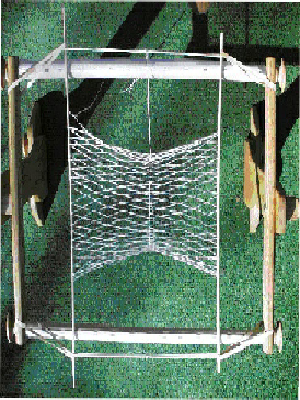 Sprang is a net type fabric formed by twisting parallel warp threads around each other. The fabric is stretchy and collapsible. Sprang can be traced back to Denmark in the early Bronze Age as well as Peru, Egypt and Norway. Sprang is useful for hairnets, handbags, belts and clothing.